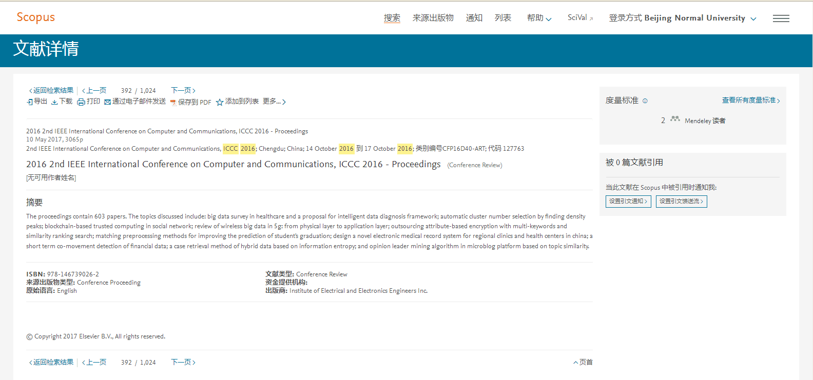 ICCC 2016 conference proceedings has been included in IEEE Xplore, and indexed by Ei Compendex and Scopus! ICCC2016会议论文集已成功被IEEE Xplore 收录 ,并被Ei Compendex 以及Scopus检索!